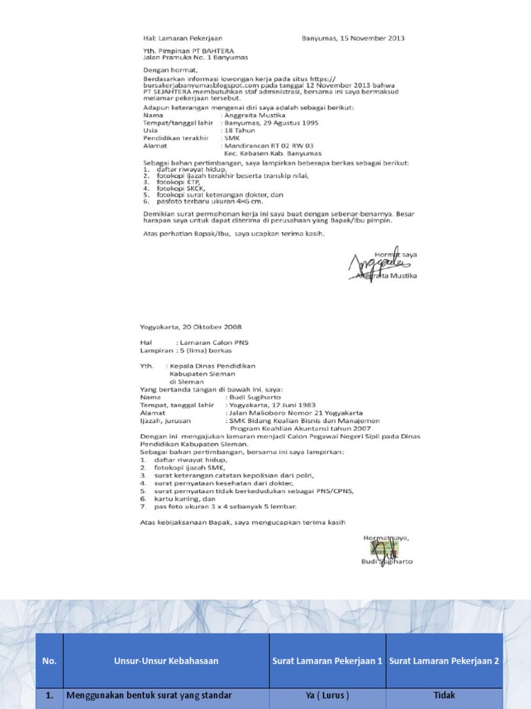 Unsur kebahasaan surat lamaran kerja · menggunakan bentuk surat standar; Ada beberapa unsur yang perlu diketahui saat akan membuat surat lamaran kerja agar lolos ketahap selanjutnya dalam proses lamaran kerja. 3.1 mengidentifikasi isi dan sistematika surat lamaran pekerjaan yang dibaca. Unsur surat lamaran pekerjaan secara visual (dapat dilihat dengan indra penglihat (mata); · menggunakan bahasa baik dan benar;